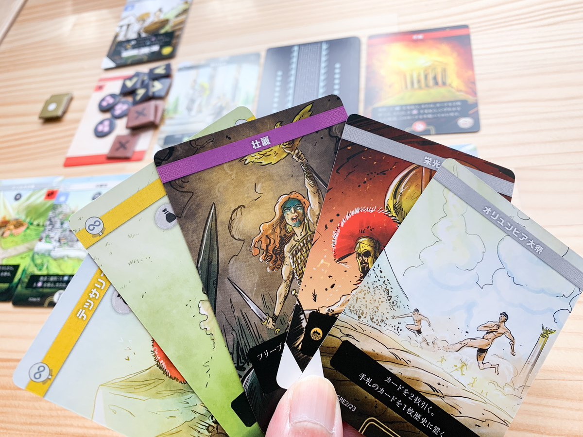 バッグからタイルを引くランダム制はありますが、アブストラクトゲームのようなソリッド感もあって意外と悩んでしまうルール。30分くらいでもしっかり遊んだ感じがあるのは今年のような時間的余裕のない環境ではかなり重宝したのです。ボドゲのソロプレイに求めてる感覚がスッと堪能できるって結構貴重ですよなー。フレーバーもローマ帝国モノだし30分でカエサル気分を味わえる魅力あるタイトル。