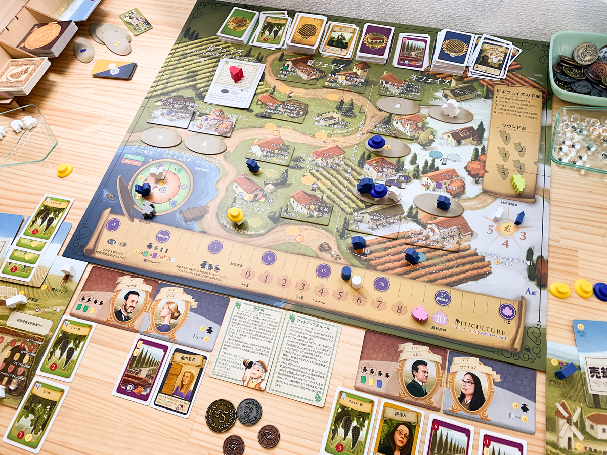 帽子を被ったアルバイトは可愛い。しかし可愛いのだけど、いつまでもバイトじゃボドゲには勝てないんだよ。労働者になろう!など雇用の格差も感じましたがそれもまた楽しい。ワイナリーの四季は拡張を入れる事で楽しさが増しますが、ドラスティックな変化はこれまであまり感じませんでした。ザ・ワールドはその中では割と思い切った変更がある拡張かなと思います。ロングセラーとなってきたワイナリーの四季シリーズ、ザ・ワールドを加える事で新しい道が開けます。ワイナリーの四季好きには是非おすすめしておきたいタイトルですよ!