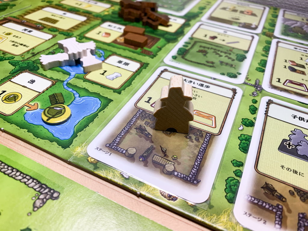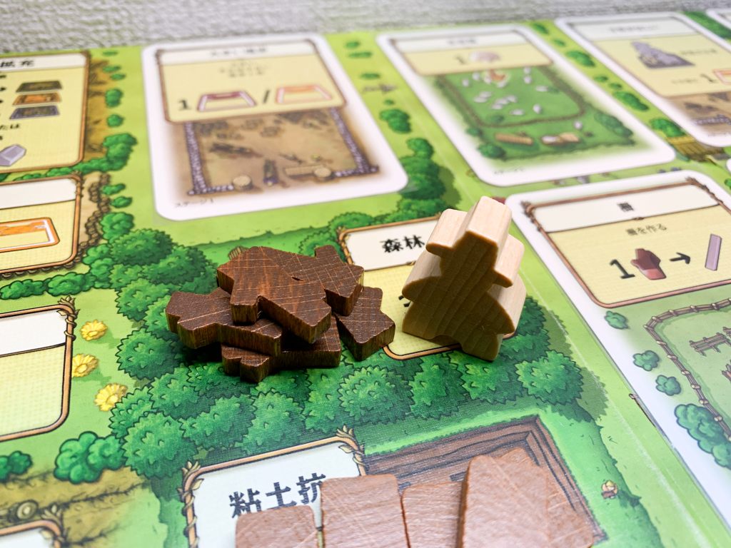 アクションボードで木材を手に入れるためにコマを動かす。鬱蒼とした森林に入って枯れ木を切って持ち帰る妄想。どんよりとした曇り空が重く頭上に広がっていて、帰り道は雨に降られるかもしれない。いやもしかしたらよく晴れた空が美しいオレンジ色の夕方で、夕食のスープを楽しみにしている日かもしれない。明日も晴れるかな?なんて想像しながら家族の待つ家に帰る。そんな天気で気分が左右されるような毎日なら、ちょっとは不便でも楽しいのだろうか?