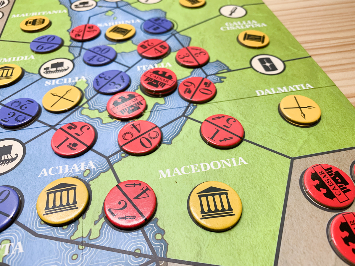 勝利条件はいち早くコントロールマーカーを置き切ること。各地に散らばる元老院タイルをうまく獲得する事であれよあれよとマーカーを置けるのだけど、チクチク他のタイルで互いを牽制しながら共和制ローマの覇権を握ろうとする訳です。コントロールマーカーにはカエサルとポンペイウスが印刷されているので、まさに第1回三頭政治の末期を盤面で再現することになるんです。