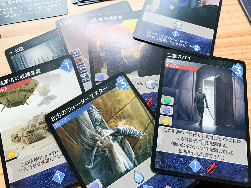 デッキを作り込んでカードをプレイし、ワーカーを各所に送り込んでいく基本メカニクスにはほとんど変更がありません。惑星の各所で行われる公国間でのマジョリティ争いも前作と同様。遊んでいる時のプレイ感はほぼ変わらずです。新規性のようなものを期待しているとちょっと残念になっちゃうかもしれません。
