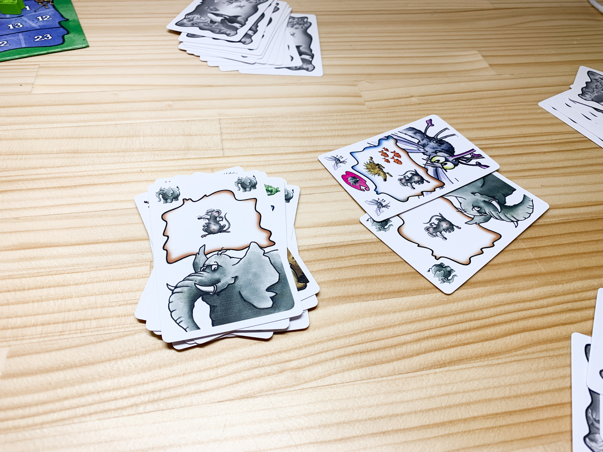 蚊は象と一緒に出すことで象としてカウントできるカードです。ひねりの効いたカードが混じっているのも面白いですな!