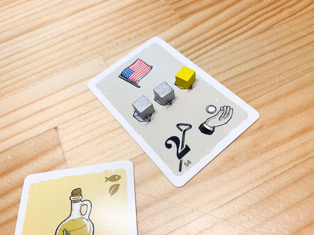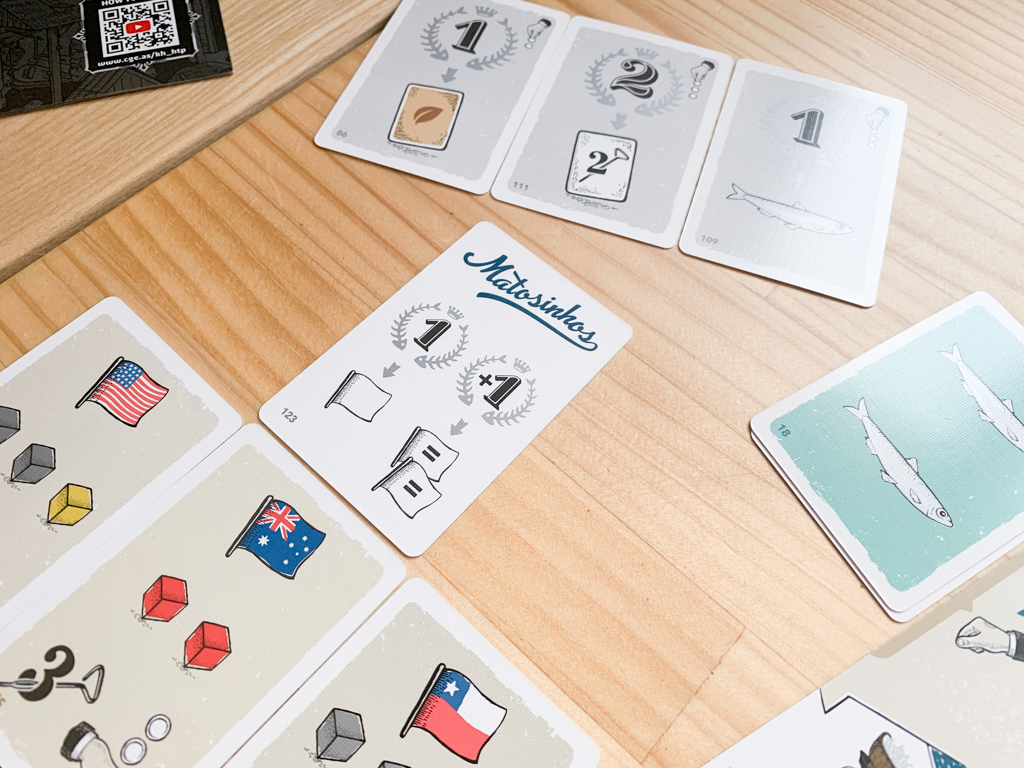 たしかにルールはそこまで難しくないんですけど、勝つためにはより多くの勝利点を集めなければならず、ランダムに出てくる生産カードのイワシだとかサバ、トマトやオイルのどれを取るのか、そして出来た缶詰をどの国に出荷するのか常に先読みを求められるルールです。
