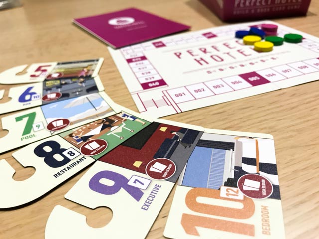 パーフェクトホテルは最高のホテルを目指して手札を積み上げて配置していくセットコレクション系のボードゲーム。サクラハントと時期を同じくして昨年発売されておりますよ。