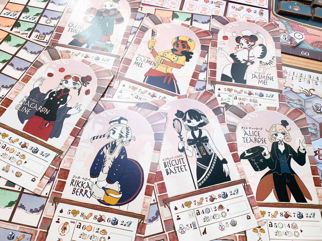 キャラクターごとに方向づけがされているので、各能力から戦略の決定ができるプレイヤーならばそこまで困らないとも思います。重量級のボドゲは普段遊ばないんだけど、スイーツランドが可愛いので遊んでみたいな!という方は、自分の選んだキャラクターの戦略についてゲームを始める前にアドバイスをもらった方が楽しめるんでは?と思いました。あくまでプレイが始まる前に、だけどね。こんな感じで進めると良いんじゃない?くらいのアドバイスがあるだけで迷子になる確率はかなり下がると思います。