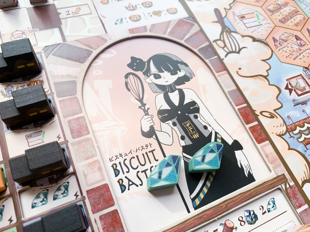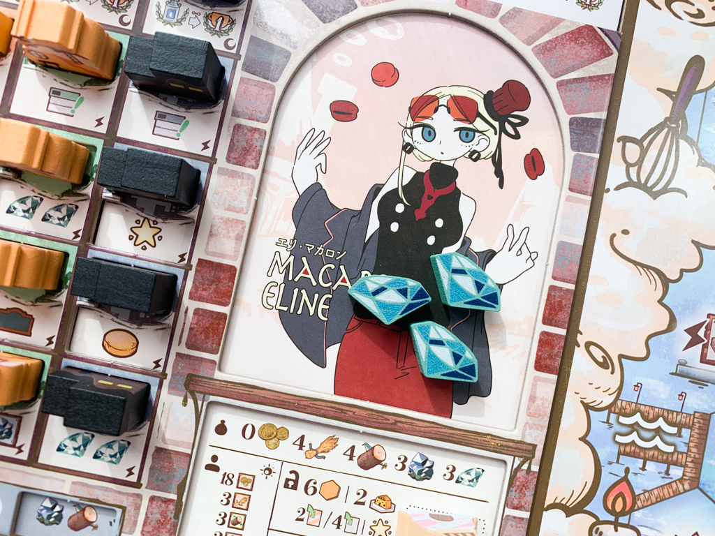 置いてみたくて仕方がなかったクッキー・ラビット。繁栄トラックを最高に伸ばせば1匹あたり7点という驚異的な勝利点をもたらす住人です。配置したときの可愛さはプライスレス。エリ・マカロンでのラビット戦略も楽しかった。