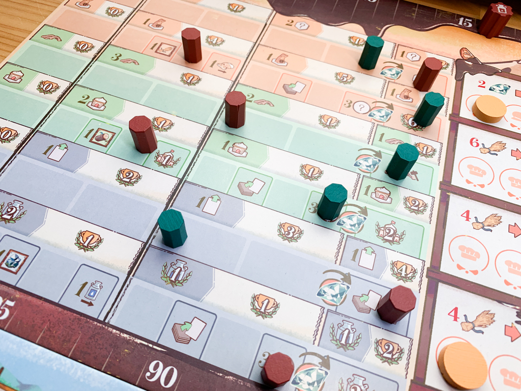スイーツランドのデザイナーは人気タイトルのアクアガーデンやオスティアを手がけた戸塚中央さん。戸塚さんの手がけるタイトルの中でもスイーツランドはかなり重めのゲームです。得点を重ねるための取捨選択や効率の最適化など、重量級ボドゲの魅力のひとつである「考えることの面白さ」をしっかり感じさせてくれるタイトルなのですが、、コレ今までで1番難しいね?