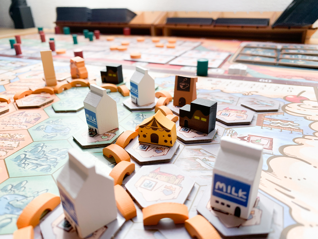 開かれた土地には建物を建てることができるので、地図ボードで発展していく国の様子を手に取るように実感できます。何もなかったボード上に建物コマが並び、道がつながっていく様子はプレイしていてこの上なく楽しいですよ!知力を尽くして街を発展させていくことを手元で実感できる素晴らしさはスイーツランドの大きな魅力。可愛さがヤバいのです。