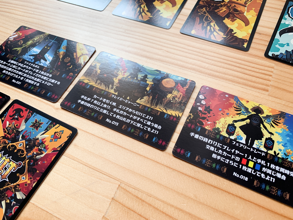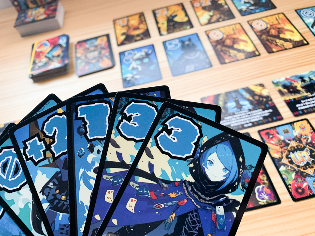 ついウルトカードの能力に目が行きがちなんですが大人の皆様ならライトなカウンティングとか読み合いを楽しめるのも良きです。数字のカード(プレイカード)は71枚しかないので山札の枚数が少なくなってくると色々考えが巡って参ります。エリアカードへと公開するカードが増えれば更に駆け引き感がグッと増すので、あえてカードを出さずに引くようなプレイも生まれることでしょう。そうでしょう。ただ間違っても子供相手にやってはダメです。恨まれます...(滝汗)