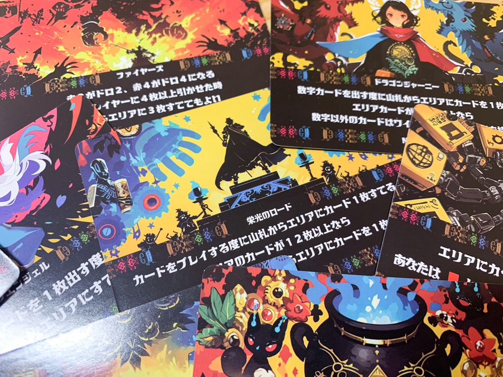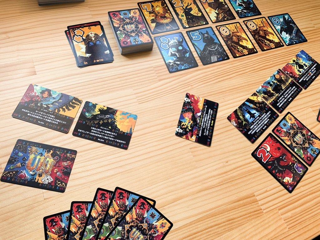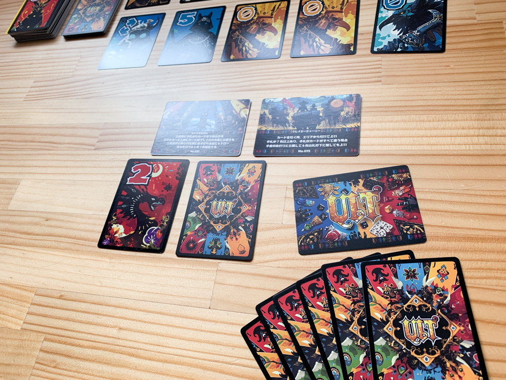 基本的にはUNO(ウノ)です。ちょっと違うのはエリアの扱い、かなり違うのはウルトカードの導入です。細かな点はルールシートをお読みいただくとして、ざっくり流れを説明しておきますよ!