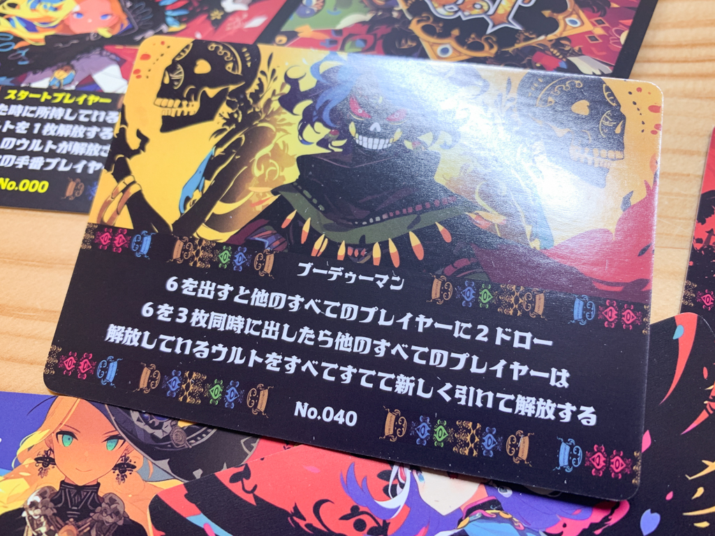 やはりなんと言ってもウルトカードの能力を考えるのが楽しい!72種類の能力をどう活用するかコンボ的なカード構成を考えて実践してみるのとかメッチャ楽しそう。ドロー効果をマシマシにしてくれるウルト能力で相手をドボドボにしてやるプレイとかうまく行ったら楽しそうよね。ただしうっかりドロースタック決められて地獄、、、みたいなことにもなるので注意しないとだな。