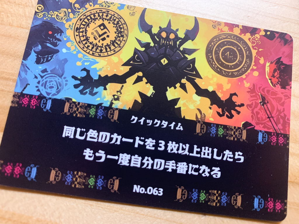 やはりウノがベースなだけに、ルールのとっつきやすさはピカイチ。部屋にふらっと入ってきた次女に軽く説明したらすぐに「遊んでみたい!」と返ってきました。小学生でも説明を聞いただけで興味を持ってくれるというのは嬉しい。カードゲームはやはりとっつきやすさってめちゃ大事よねー。子供はすぐ遊びたいし。